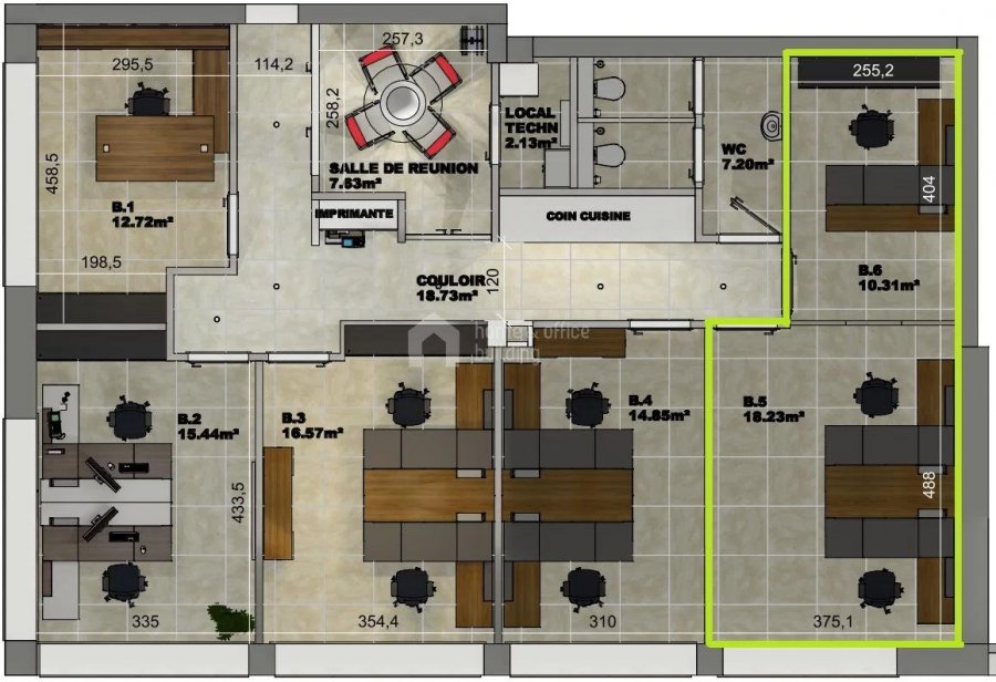 Le bureau avec une surface de 29 m² dispose également d'un hall d’entrée, d'une cuisine équipée, d'une salle de réunion et de deux WC séparés.